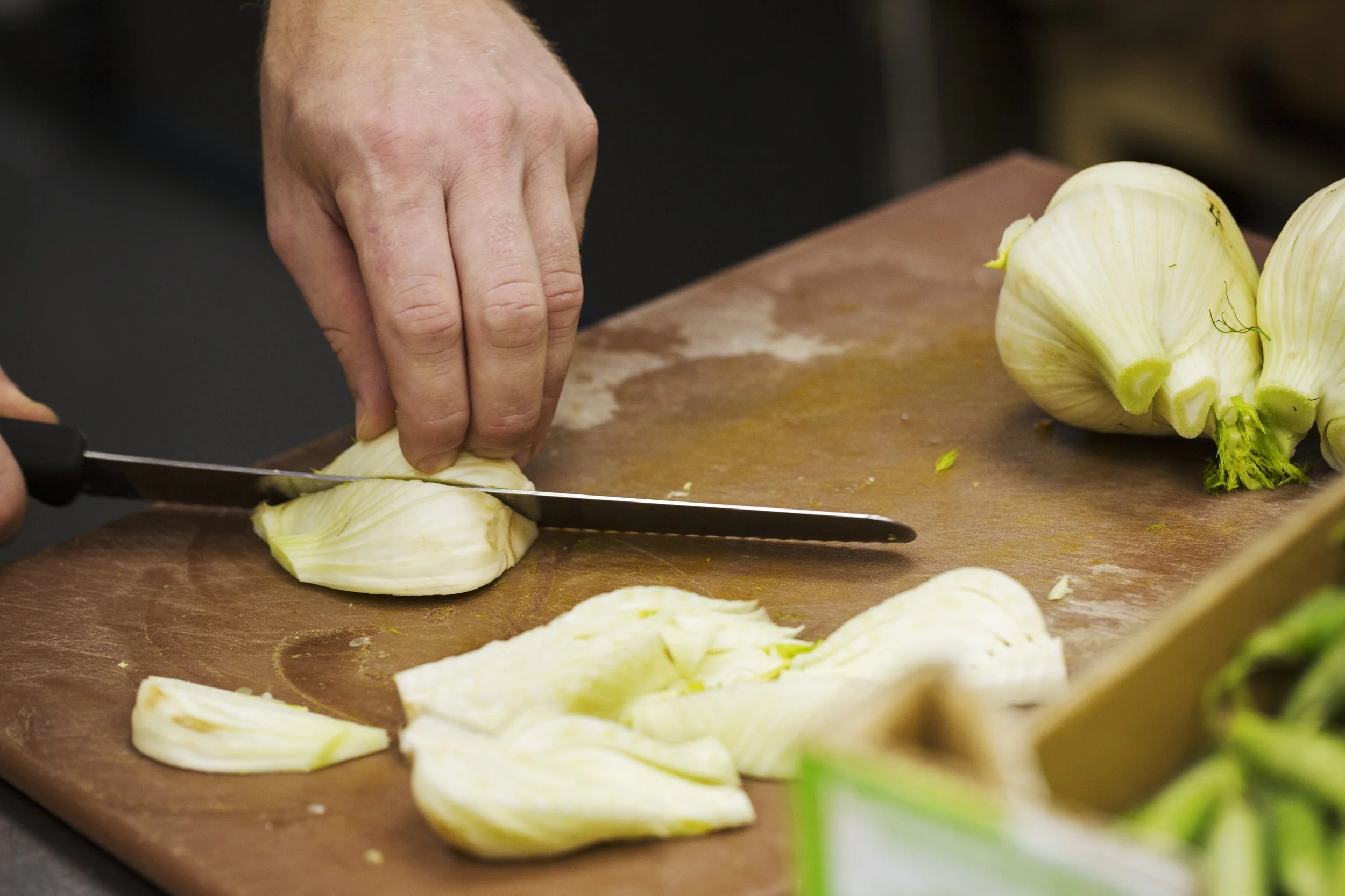 Fenchel rüsten und in Würfel oder Spalten schneiden