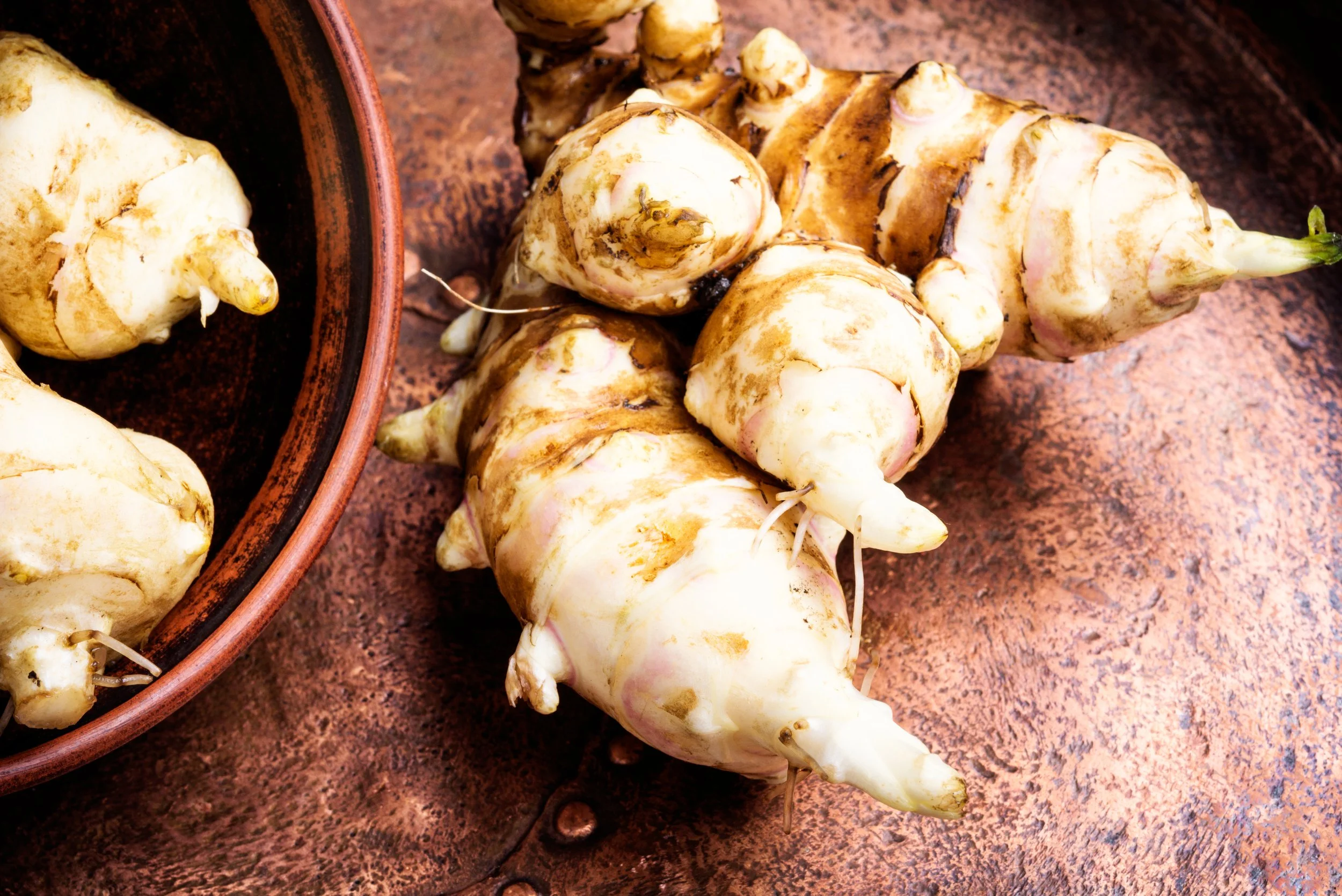 Topinamur und Karotten schälen und in dünne Scheiben schneiden