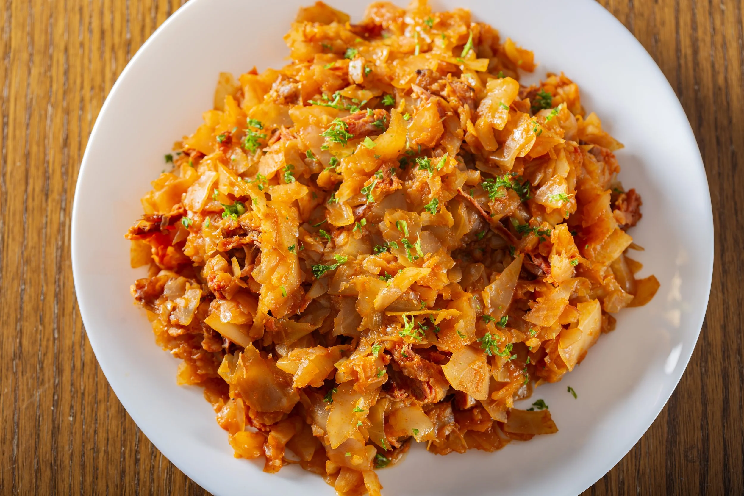 Knöpfli, Spätzli oder Schupfnudeln in etwas Butter goldgelb braten. Zusammen mit dem Weisskabis-Fleisch anrichten