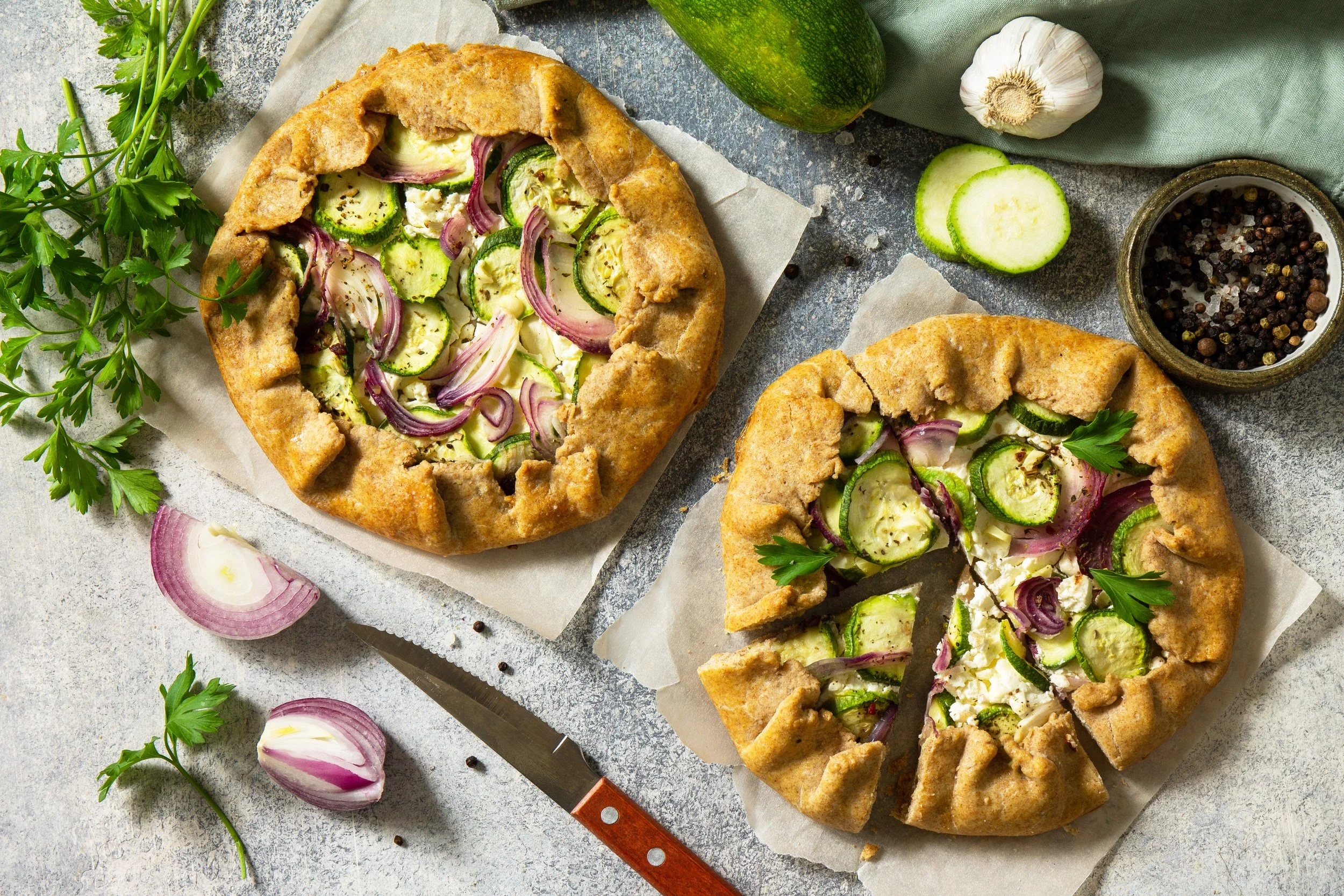 Mit Gewürzen abschmecken und mit Zucchetti, roter Zwiebel sowie Tomaten belegen.