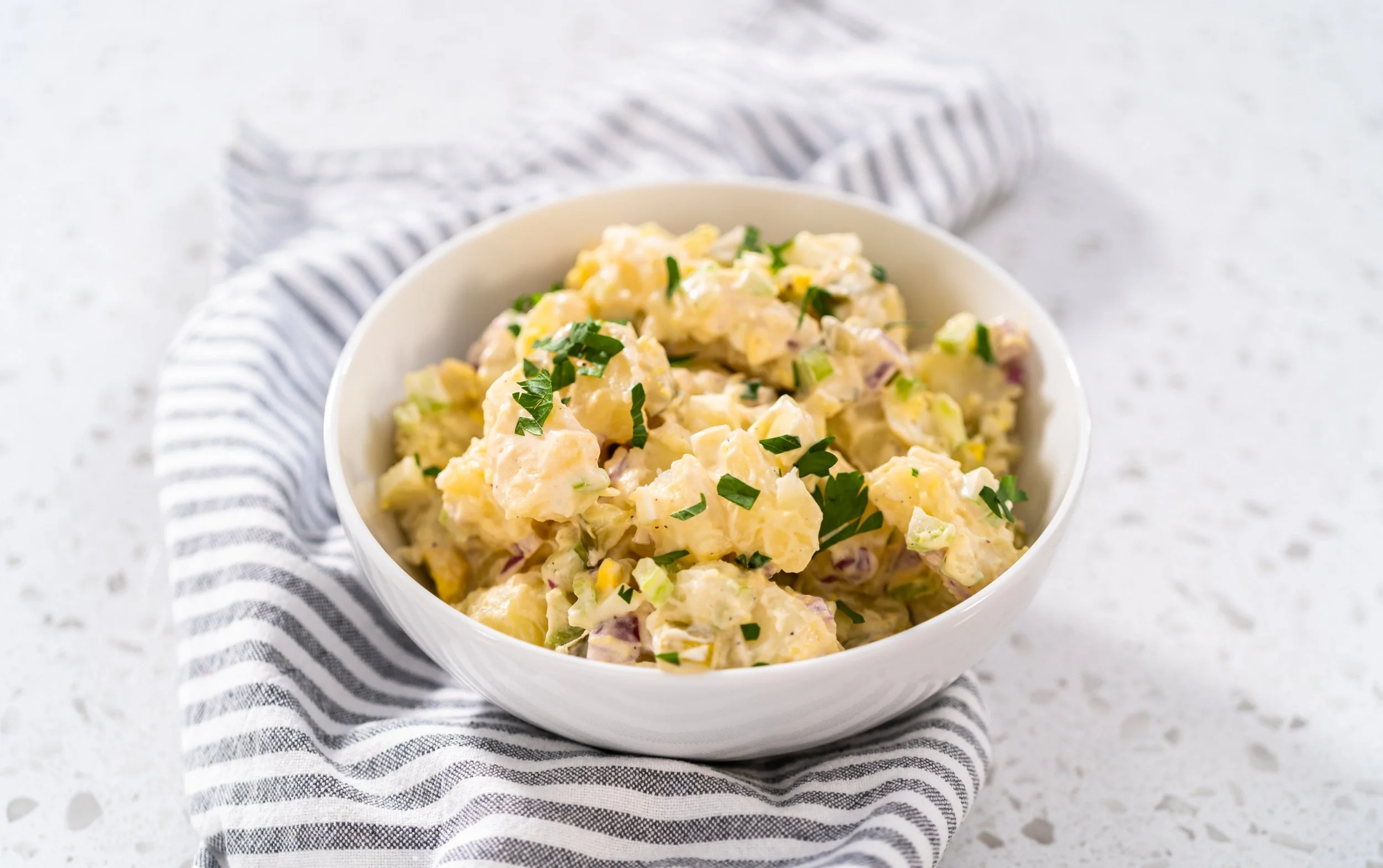 Die gewürfelten Kartoffeln und Sellerie in einer Schüssel mit der Sauce vermengen. In Schalen anrichten und nach Belieben mit Sellerieblättern und Walnüssen garnieren.